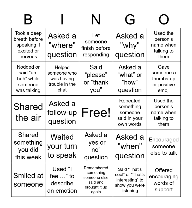 This bingo card has a free space and 24 words: Waited your turn to speak, Used “I feel…” to describe an emotion, Said “please” or “thank you”, Smiled at someone, Used the person’s name when talking to them, Took a deep breath before speaking if excited or nervous, Nodded or said “uh-huh” while someone was talking, Asked a "where" question, Repeated something someone said in your own words, Asked a “yes or no” question, Asked a “what” or “how” question, Shared the air, Asked a "when" question, Encouraged someone else to talk, Helped someone who was having trouble in the chat, Said “That’s cool” or “That’s interesting” to show you were listening, Used the person’s name when talking to them, Let someone finish before responding, Gave someone a thumbs-up or positive emoji, Asked a follow-up question, Offered encouraging words of support, Shared something you did this week, Asked a "why" question and Remembered something someone else said and brought it up again.