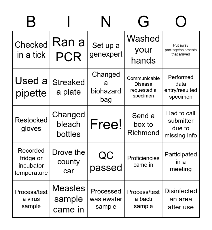 This bingo card has a free space and 30 words: Measles sample came in, Category A box arrived, Changed bleach bottles, Checked in Milk, Checked in a tick, Set up a genexpert, Streaked a plate, QC passed, Send a box to Richmond, Processed wastewater sample, Had to call submitter due to missing info, Disinfected an area after use, Process/test a bacti sample, Used the autoclave, Performed data entry/resulted specimen, Rabies head came in, Proficiencies came in, Recorded fridge or incubator temperature, Drove the county car, Put away package/shipments that arrived, Restocked gloves, Pulsenet organism passed 30X coverage, Ran a PCR, Communicable Disease requested a specimen, Used a pipette, Washed your hands, Participated in a meeting, Process/test a virus sample, Changed a biohazard bag and Used a centrifuge.