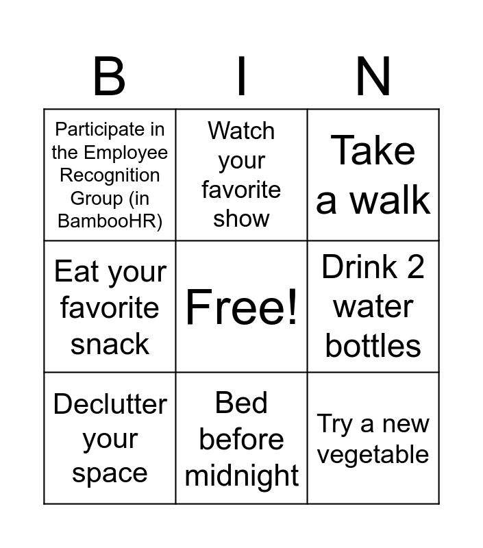 This bingo card has a free space and 8 words: Drink 2 water bottles, Take a walk, Watch your favorite show, Declutter your space, Participate in the Employee Recognition Group (in BambooHR), Try a new vegetable, Eat your favorite snack and Bed before midnight.
