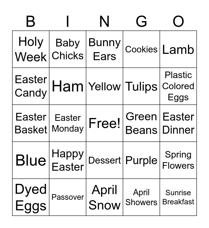 This bingo card has a free space and 24 words: Happy Easter, Passover, Yellow, Dyed Eggs, Lamb, Holy Week, Easter Candy, Baby Chicks, Green Beans, Dessert, Tulips, Easter Basket, Purple, Spring Flowers, Ham, April Showers, Easter Dinner, Bunny Ears, Plastic Colored Eggs, Easter Monday, Sunrise Breakfast, Blue, Cookies and April Snow.