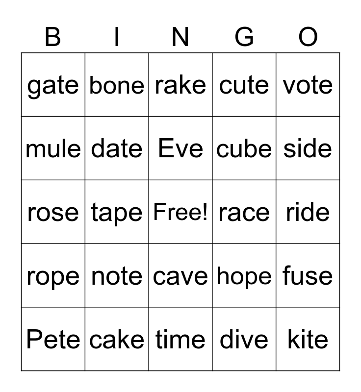 This bingo card has a free space and 30 words: cake, name, tape, bake, gate, rake, date, cave, race, time, ride, kite, dive, line, side, bike, hope, rope, note, vote, rose, cone, bone, cube, mule, cute, fuse, Pete, Eve and these.