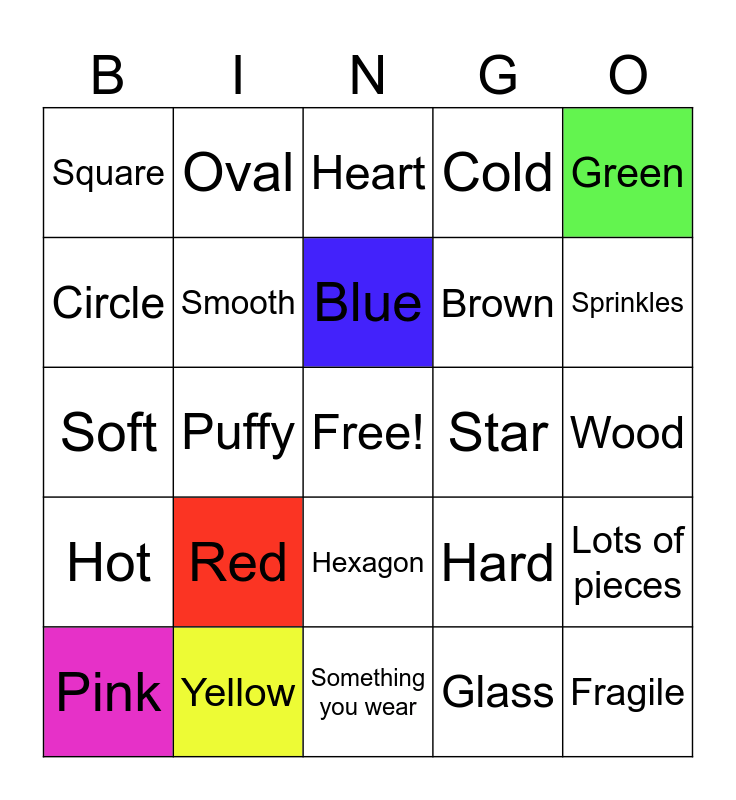 This bingo card has a free space and 24 words: Red, Yellow, Blue, Pink, Green, Square, Circle, Oval, Star, Hexagon, Brown, Soft, Hard, Lots of pieces, Smooth, Glass, Wood, Heart, Sprinkles, Puffy, Fragile, Hot, Cold and Something you wear.