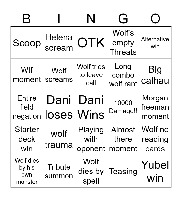 This bingo card has a free space and 25 words: wolf trauma, Wolf dies by spell, Wolf tries to leave call, Wolf dies by his own monster, Alternative win, Scoop, Wtf moment, Helena scream, 10000 Damage!!, Playing with oponent, Long combo wolf rant, Entire field negation, Almost there moment, Wolf no reading cards, Wolf screams, Wolf gets ashed, Morgan freeman moment, OTK, Big calhau, Dani loses, Yubel win, Tribute summon, Starter deck win, Wolf's empty Threats and Teasing.