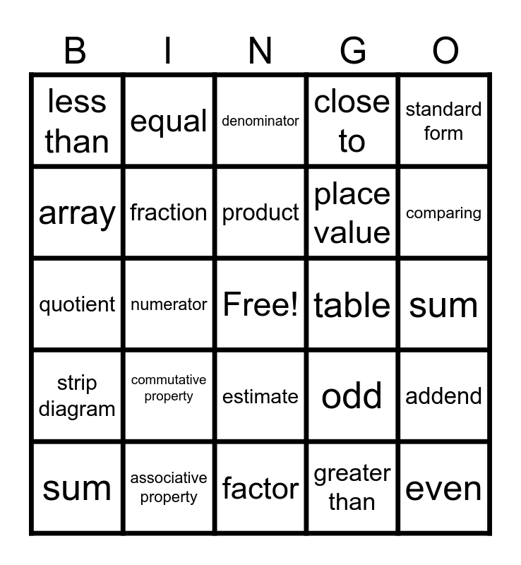 This bingo card has a free space and 25 words: commutative property, factor, product, sum, standard form, less than, array, equal, table, estimate, place value, quotient, odd, addend, fraction, area model, sum, denominator, comparing, numerator, even, associative property, strip diagram, close to and greater than.