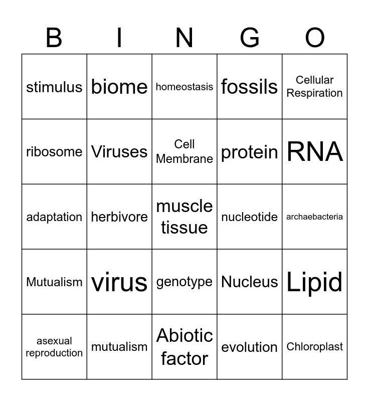 This bingo card has a free space and 44 words: Carbohydrates, Chloroplast, Prokaryote, asexual reproduction, Protein, evolution, homeostasis, zygote, Cellular Respiration, mutualism, fossils, nucleotide, genotype, virus, habitat, Abiotic factor, global warming, adaptation, species, RNA, biome, chlorophyll, Natural Selection, stimulus, Genus and Species, archaebacteria, order, plantae, Nucleus, Mutualism, DNA, Lipid, ATCG, URACIL, herbivore, parasitism, biotic, hypotonic, Cell Membrane, ribosome, protein, Chromosomes, Viruses and Lytic.