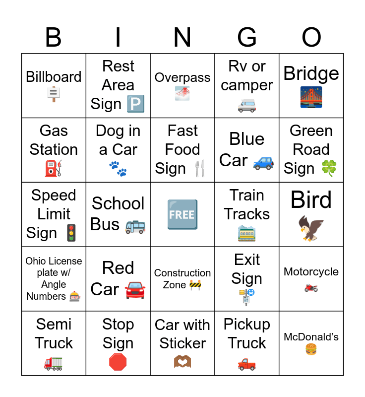 This bingo card has a free space and 24 words: Red Car π, Stop Sign π, Fast Food Sign π΄, Semi Truck π, Bridge π, Billboard πͺ§, Gas Station β½οΈ, Rest Area Sign π ΏοΈ, Train Tracks π, Construction Zone π§, Blue Car π, Speed Limit Sign π¦, Exit Sign π, Motorcycle ποΈ, Dog in a Car πΎ, Pickup Truck π», Bird π¦ , Overpass π, Green Road Sign π, School Bus π, McDonaldβs π, Ohio License plate w/ Angle Numbers π°, Rv or camper π and Car with Sticker π«ΆπΎ.