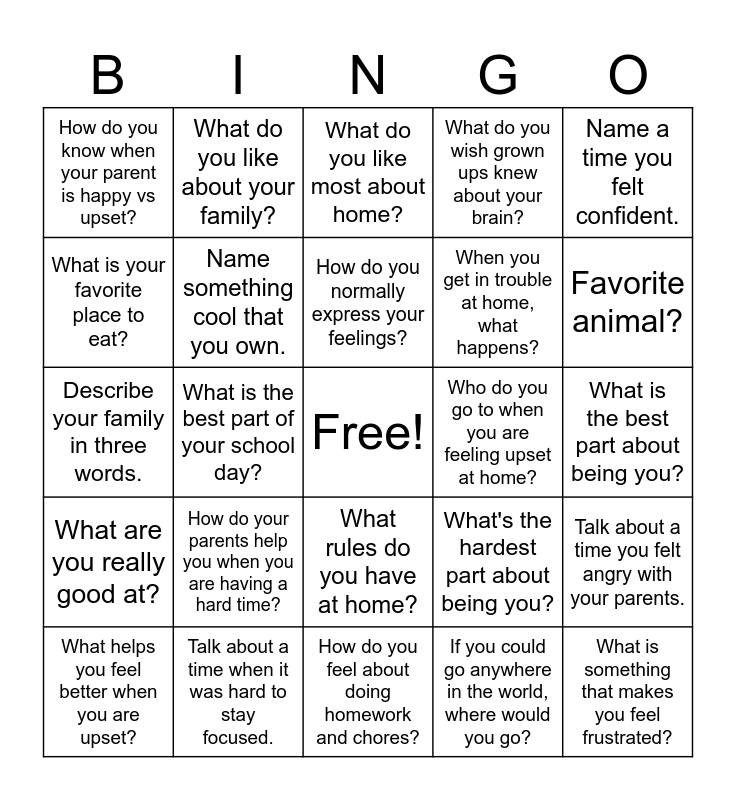 This bingo card has a free space and 24 words: How do your parents help you when you are having a hard time?, Talk about a time when it was hard to stay focused., How do you normally express your feelings?, What helps you feel better when you are upset?, Name a time you felt confident., How do you know when your parent is happy vs upset?, What is your favorite place to eat?, What do you like about your family?, Who do you go to when you are feeling upset at home?, What rules do you have at home?, When you get in trouble at home, what happens?, Describe your family in three words., What's the hardest part about being you?, Talk about a time you felt angry with your parents., Name something cool that you own., If you could go anywhere in the world, where would you go?, What is the best part about being you?, What do you like most about home?, Favorite animal?, What is the best part of your school day?, What is something that makes you feel frustrated?, What are you really good at?, What do you wish grown ups knew about your brain? and How do you feel about doing homework and chores?.