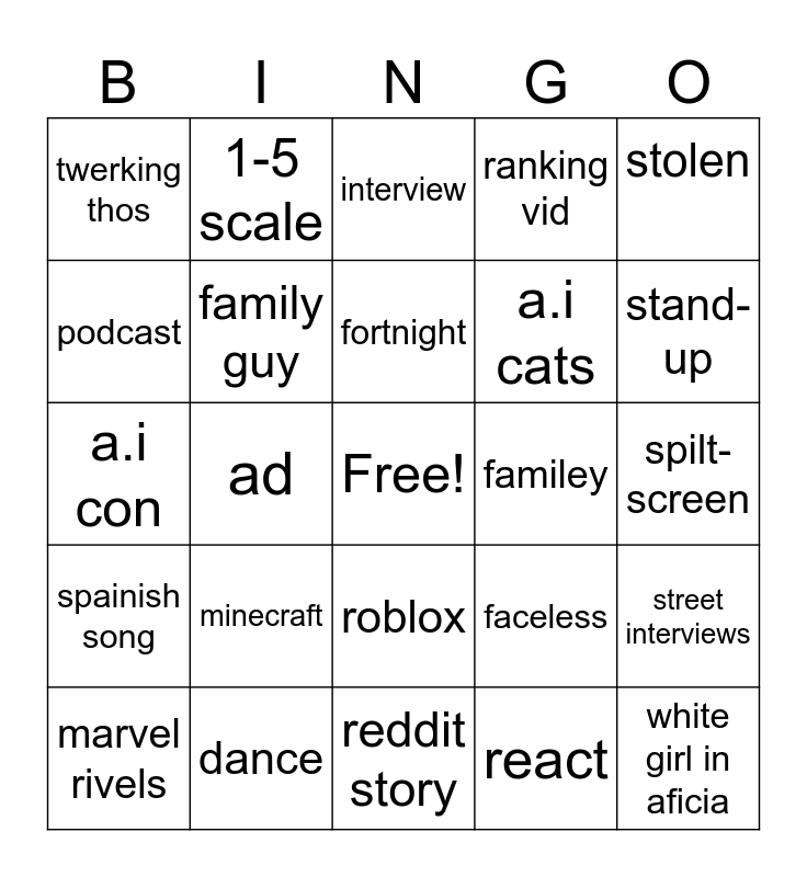 This bingo card has a free space and 24 words: minecraft, dance, fortnight, marvel rivels, stolen, twerking thos, podcast, 1-5 scale, familey, roblox, a.i cats, a.i con, faceless, street interviews, family guy, react, spilt-screen, interview, stand-up, ad, white girl in aficia, spainish song, ranking vid and reddit story.