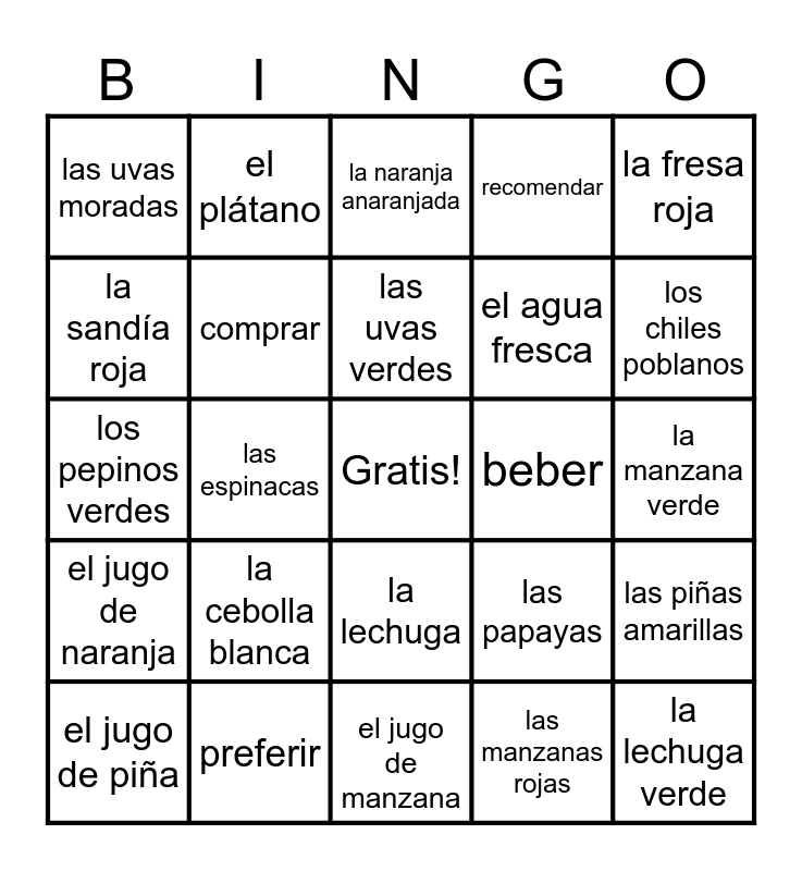 This bingo card has a free space and 42 words: las fresas, las uvas verdes, el pepino verde, la cebolla blanca, las manzanas rojas, las piñas amarillas, la lechuga verde, el chile poblano, la naranja anaranjada, la lechuga, la manzana verde, los chiles poblanos, las espinacas, la fresa roja, las espinacas verdes, las papayas, la piña amarilla, los pepinos verdes, la papaya, el plátano, la sandía roja, la papa blanca, las cebollas blancas, las uvas moradas, las papas blancas, el agua, el agua fresca, el batido verde, los batidos verdes, el jugo, pedir, el jugo de naranja, comprar, el jugo de manzana, pensar, el jugo de piña, preferir, beber, probar, querer, recomendar and vender.