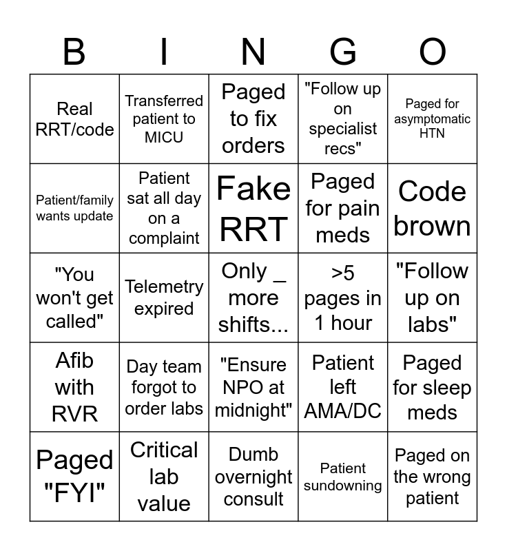 This bingo card has a free space and 24 words: Day team forgot to order labs, Critical lab value, Fake RRT, Paged "FYI", Paged for asymptomatic HTN, Real RRT/code, Patient/family wants update, Transferred patient to MICU, >5 pages in 1 hour, "Ensure NPO at midnight", Paged for pain meds, "You won't get called", Patient left AMA/DC, Paged for sleep meds, Patient sat all day on a complaint, Patient sundowning, "Follow up on labs", Paged to fix orders, Code brown, Telemetry expired, Paged on the wrong patient, Afib with RVR, "Follow up on specialist recs" and Dumb overnight consult.