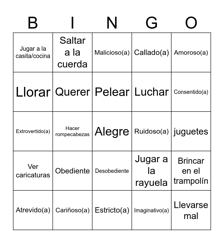 This bingo card has 44 words: Free!, Alegre, Amable, Atrevido(a), Curioso(a), Imaginativo(a), Malicioso(a), Considerado(a), Amoroso(a), Cariñoso(a), Callado(a), Ruidoso(a), Desobediente, Obediente, Tímido(a), Estricto(a), Flexible, Extrovertido(a), Introvertido(a), Consentido(a), Saltar a la cuerda, Coleccionar animales de peluche, Jugar juegos de mesa, Jugar a la casita/cocina, Jugar con muñecas, juguetes, Jugar al pilla pilla, Jugar al escondite o las escondidas, Jugar a la rayuela, Ver caricaturas, Columpiarse, Brincar en el trampolín, Patinar, Subirse a los árboles, Hacer rompecabezas, Colorear, Llevarse bien, Llevarse mal, Pelear, Llorar, Luchar, Amar, Querer and Odiar.