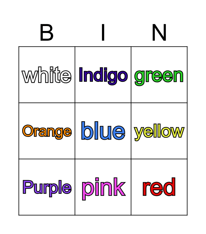 This bingo card has 12 words: Brown, red, blue, yellow, Indigo, green, pink, black, white, Orange, Purple and Grey.