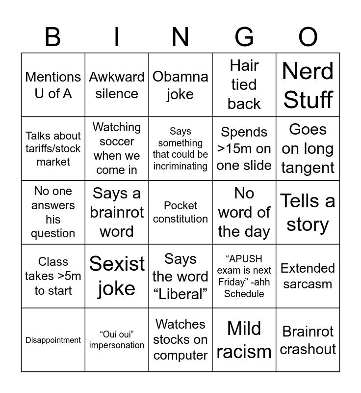 This bingo card has 25 words: Sexist joke, Watches stocks on computer, Says something that could be incriminating, Disappointment, Nerd Stuff, Mentions U of A, Talks about tariffs/stock market, Awkward silence, No word of the day, Says the word “Liberal”, Spends >15m on one slide, No one answers his question, “APUSH exam is next Friday” -ahh Schedule, Extended sarcasm, Watching soccer when we come in, Brainrot crashout, Tells a story, Obamna joke, Goes on long tangent, Says a brainrot word, Pocket constitution, “Oui oui” impersonation, Class takes >5m to start, Hair tied back and Mild racism.