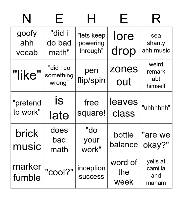 This bingo card has a free space and 24 words: does bad math, "cool?", pen flip/spin, marker fumble, sea shanty ahh music, goofy ahh vocab, "like", "did i do bad math", leaves class, "do your work", zones out, "pretend to work", bottle balance, "are we okay?", "did i do something wrong", word of the week, "uhhhhhh", "lets keep powering through", weird remark abt himself, is late, yells at camilla and maham, brick music, lore drop and inception success.