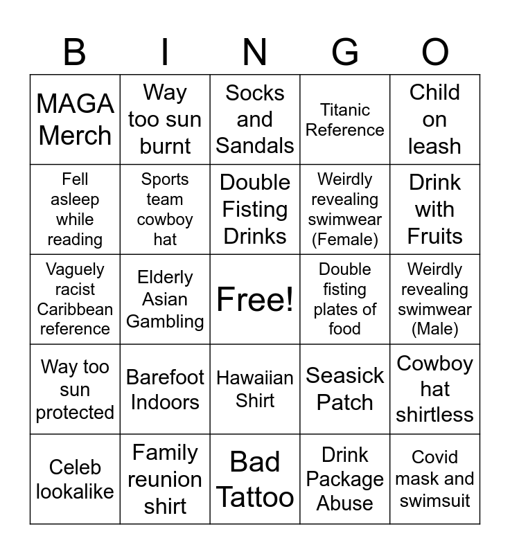This bingo card has a free space and 24 words: Barefoot Indoors, Family reunion shirt, Double Fisting Drinks, Celeb lookalike, Child on leash, MAGA Merch, Fell asleep while reading, Way too sun burnt, Double fisting plates of food, Hawaiian Shirt, Weirdly revealing swimwear (Female), Vaguely racist Caribbean reference, Seasick Patch, Cowboy hat shirtless, Sports team cowboy hat, Drink Package Abuse, Weirdly revealing swimwear (Male), Socks and Sandals, Drink with Fruits, Elderly Asian Gambling, Covid mask and swimsuit, Way too sun protected, Titanic Reference and Bad Tattoo.