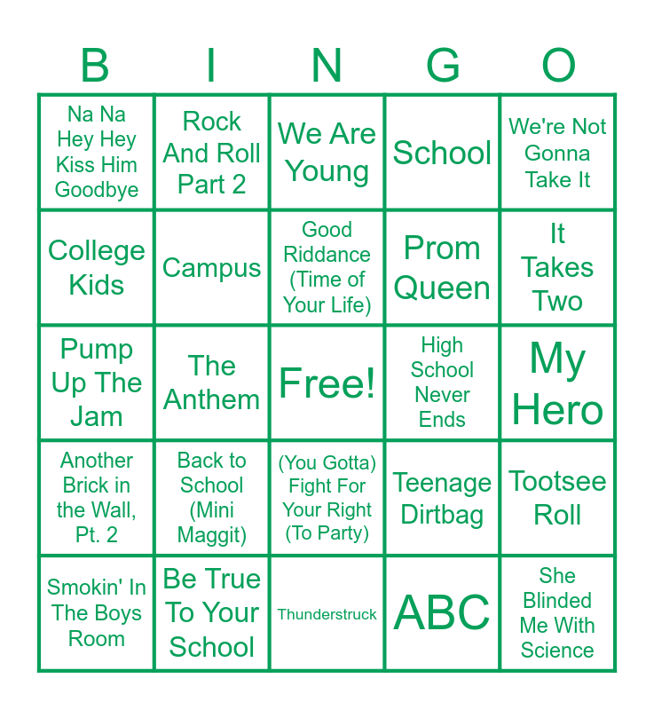 This bingo card has a free space and 45 words: Weird Science, She Blinded Me With Science, Hot for Teacher, Smokin' In The Boys Room, Don't You (Forget About Me), ABC, We Are Young, School's Out, We're Not Gonna Take It, Be True To Your School, School, High School Never Ends, (You Gotta) Fight For Your Right (To Party), Back to School (Mini Maggit), We Will Rock You, Thunderstruck, Gonna Make You Sweat (Everybody Dance Now), Pump Up The Jam, Seven Nation Army, It Takes Two, Rock And Roll Part 2, Unbelievable, All I Do Is Win, Na Na Hey Hey Kiss Him Goodbye, Hit Me With Your Best Shot, My Hero, Remember the Name, Another One Bites The Dust, Teenage Dirtbag, Another Brick in the Wall, Pt. 2, Bill Nye the Science Guy, Tootsee Roll, Young, Wild & Free, Smells Like Teen Spirit, I'm Just a Kid, The Anthem, Graduation (Friends Forever), Good Old Days, We're All In This Together, Good Riddance (Time of Your Life), College Kids, Prom Queen, Sk8er Boi, Campus and We're Going to Be Friends.