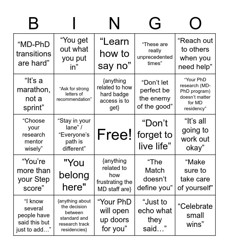 This bingo card has a free space and 24 words: "You belong here", {anything about the decision between standard and research track residencies}, {anything related to how hard badge access is to get}, “I know several people have said this but just to add…”, “Reach out to others when you need help”, “MD-PhD transitions are hard”, “It’s a marathon, not a sprint”, “You get out what you put in”, “Don’t forget to live life”, {anything related to how frustrating the MD staff are}, “Don’t let perfect be the enemy of the good”, “Choose your research mentor wisely”, “The Match doesn’t define you”, “Make sure to take care of yourself”, “Ask for strong letters of recommendation”, “Just to echo what they said…”, “It’s all going to work out okay”, “Learn how to say no”, “Your PhD research (MD-PhD program) doesn’t matter for MD residency”, “Stay in your lane” / “Everyone’s path is different”, “Celebrate small wins”, “You’re more than your Step score”, “These are really unprecedented times” and “Your PhD will open up doors for you”.