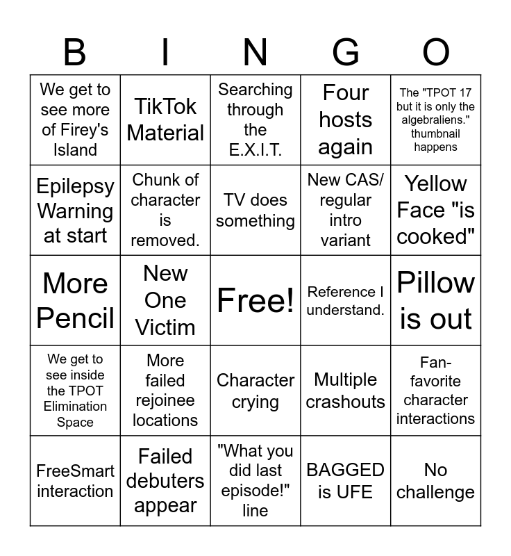This bingo card has a free space and 24 words: More failed rejoinee locations, Failed debuters appear, TV does something, FreeSmart interaction, The "TPOT 17 but it is only the algebraliens." thumbnail happens, We get to see more of Firey's Island, Epilepsy Warning at start, TikTok Material, Reference I understand., Character crying, New CAS/ regular intro variant, More Pencil, Multiple crashouts, Fan-favorite character interactions, Chunk of character is removed., BAGGED is UFE, Pillow is out, Searching through the E.X.I.T., Yellow Face "is cooked", New One Victim, No challenge, We get to see inside the TPOT Elimination Space, Four hosts again and "What you did last episode!" line.