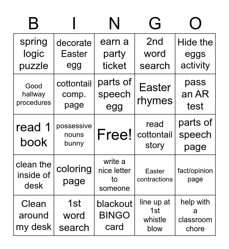 This bingo card has a free space and 24 words: coloring page, 1st word search, parts of speech egg, Clean around my desk, Hide the eggs activity, spring logic puzzle, Good hallway procedures, decorate Easter egg, read cottontail story, write a nice letter to someone, Easter rhymes, read 1 book, Easter contractions, fact/opinion page, cottontail comp. page, line up at 1st whistle blow, parts of speech page, earn a party ticket, pass an AR test, possessive nouns bunny, help with a classroom chore, clean the inside of desk, 2nd word search and blackout BINGO card.