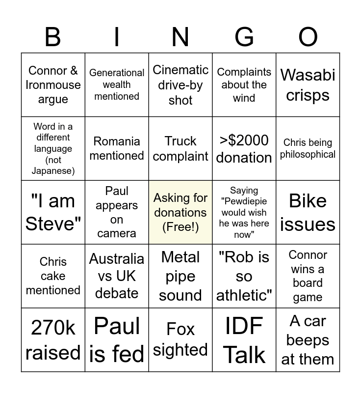 This bingo card has a free space and 24 words: Australia vs UK debate, Paul is fed, Truck complaint, 270k raised, Wasabi crisps, Connor & Ironmouse argue, Word in a different language (not Japanese), Generational wealth mentioned, Saying "Pewdiepie would wish he was here now", Metal pipe sound, >$2000 donation, "I am Steve", "Rob is so athletic", Connor wins a board game, Romania mentioned, IDF Talk, Bike issues, Cinematic drive-by shot, Chris being philosophical, Paul appears on camera, A car beeps at them, Chris cake mentioned, Complaints about the wind and Fox sighted.