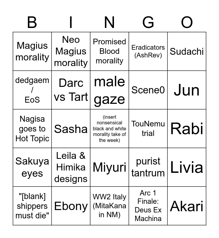 This bingo card has a free space and 24 words: "[blank] shippers must die", Leila & Himika designs, male gaze, Arc 1 Finale: Deus Ex Machina, Sudachi, Magius morality, Neo Magius morality, Promised Blood morality, TouNemu trial, Rabi, Nagisa goes to Hot Topic, Darc vs Tart, purist tantrum, Livia, dedgaem / EoS, Ebony, WW2 Italy (MitaKana in NM), Eradicators (AshRev), Jun, Sakuya eyes, Sasha, Miyuri, Scene0 and Akari.