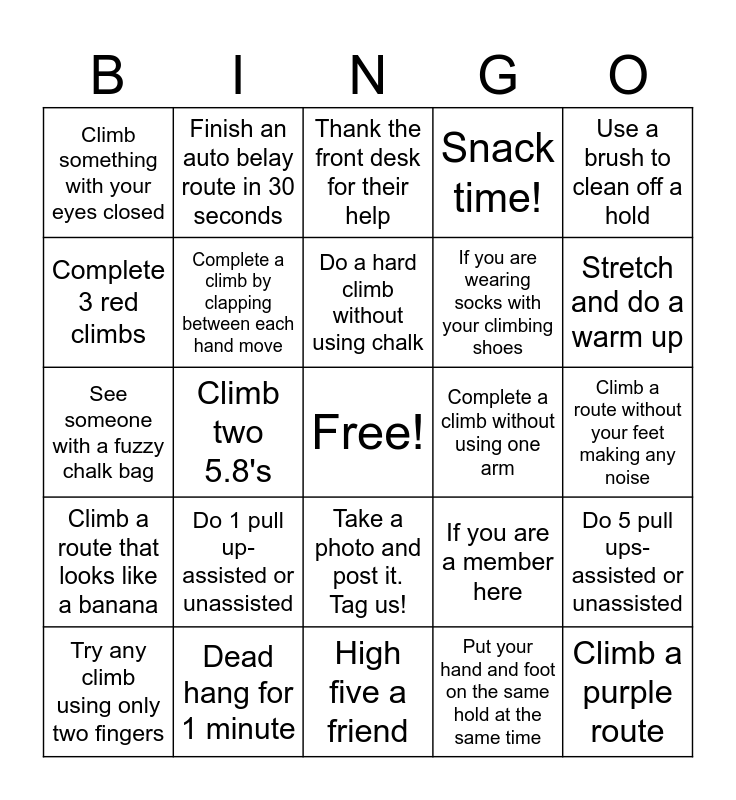 This bingo card has a free space and 24 words: Do 1 pull up- assisted or unassisted, Dead hang for 1 minute, Do a hard climb without using chalk, Try any climb using only two fingers, Use a brush to clean off a hold, Climb something with your eyes closed, Complete 3 red climbs, Finish an auto belay route in 30 seconds, Complete a climb without using one arm, Take a photo and post it. Tag us!, If you are wearing socks with your climbing shoes, See someone with a fuzzy chalk bag, If you are a member here, Do 5 pull ups- assisted or unassisted, Complete a climb by clapping between each hand move, Put your hand and foot on the same hold at the same time, Climb a route without your feet making any noise, Thank the front desk for their help, Stretch and do a warm up, Climb two 5.8's, Climb a purple route, Climb a route that looks like a banana, Snack time! and High five a friend.