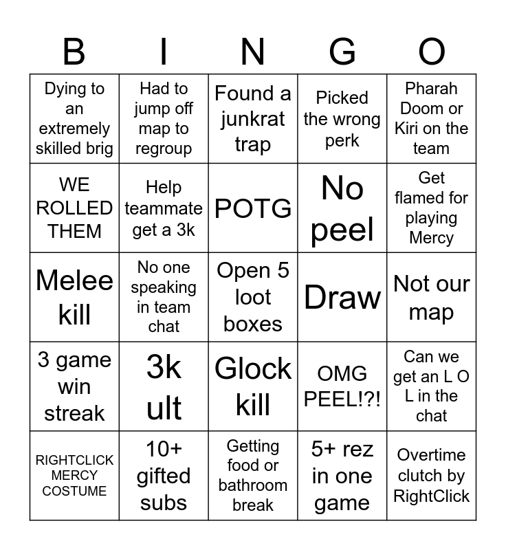 This bingo card has a free space and 24 words: 3k ult, 10+ gifted subs, POTG, RIGHTCLICK MERCY COSTUME, Pharah Doom or Kiri on the team, Dying to an extremely skilled brig, WE ROLLED THEM, Had to jump off map to regroup, Draw, Glock kill, No peel, Melee kill, OMG PEEL!?!, Can we get an L O L in the chat, Help teammate get a 3k, 5+ rez in one game, Not our map, Found a junkrat trap, Get flamed for playing Mercy, No one speaking in team chat, Overtime clutch by RightClick, 3 game win streak, Picked the wrong perk and Getting food or bathroom break.