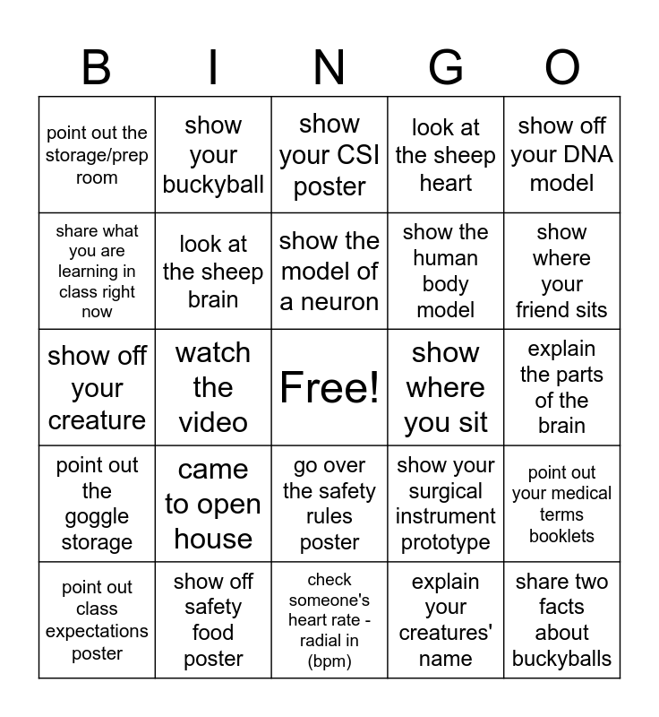 This bingo card has a free space and 24 words: came to open house, show off safety food poster, show the model of a neuron, point out class expectations poster, show off your DNA model, point out the storage/prep room, share what you are learning in class right now, show your buckyball, show where you sit, go over the safety rules poster, show the human body model, show off your creature, show your surgical instrument prototype, point out your medical terms booklets, look at the sheep brain, explain your creatures' name, explain the parts of the brain, show your CSI poster, show where your friend sits, watch the video, share two facts about buckyballs, point out the goggle storage, look at the sheep heart and check someone's heart rate -radial in (bpm).