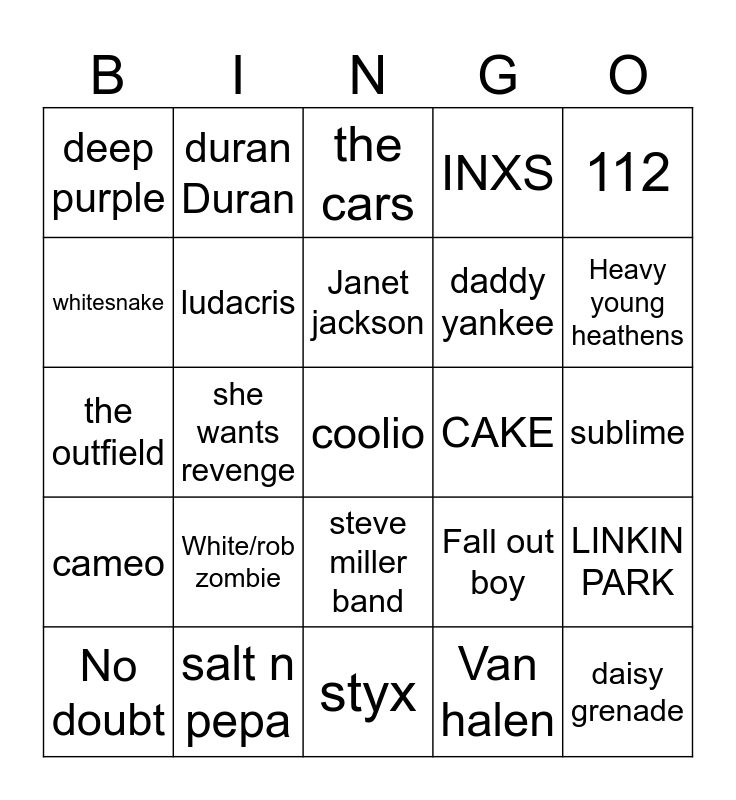 This bingo card has 25 words: White/rob zombie, styx, Janet jackson, No doubt, 112, deep purple, whitesnake, duran Duran, CAKE, steve miller band, daddy yankee, the outfield, Fall out boy, LINKIN PARK, ludacris, daisy grenade, sublime, the cars, Heavy young heathens, she wants revenge, coolio, salt n pepa, cameo, INXS and Van halen.