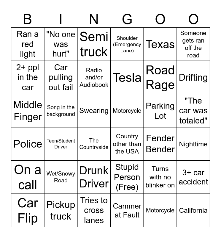 This bingo card has 36 words: Stupid Person (Free), Drunk Driver, Cammer at Fault, 2+ ppl in the car, Police, Motorcycle, Car pulling out fail, Tries to cross lanes, Texas, Turns with no blinker on, Drifting, Shoulder (Emergency Lane), 3+ car accident, Song in the background, Tesla, Ran a red light, On a call, Parking Lot, Middle Finger, Semi truck, Swearing, Teen/Student Driver, Country other than the USA, The Countryside, Fender Bender, "No one was hurt", Road Rage, Pickup truck, Radio and/or Audiobook, Someone gets ran off the road, California, Car Flip, Nighttime, "The car was totaled", Wet/Snowy Road and Motorcycle.