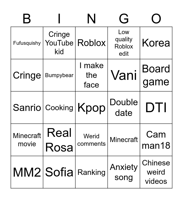 This bingo card has a free space and 24 words: Real Rosa, Sofia, I make the face, MM2, Korea, Fufusquishy, Cringe, Cringe YouTube kid, Double date, Werid comments, Vani, Sanrio, Minecraft, Cam man18, Bumpybear, Anxiety song, DTI, Roblox, Board game, Cooking, Chinese weird videos, Minecraft movie, Low quality Roblox edit and Ranking.