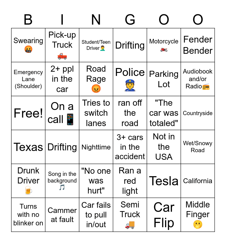 This bingo card has 36 words: Ran a red light, "No one was hurt", Semi Truck🚚, Emergency Lane (Shoulder), Texas, ran off the road, 2+ ppl in the car, Car fails to pull in/out, Motorcycle🏍️, Tesla, Audiobook and/or Radio📻, Drifting, California, On a call📱, Police👮, Swearing🤬, Drunk Driver🍺, "The car was totaled", Free!, Student/Teen Driver🤦♂️, Tries to switch lanes, Drifting, 3+ cars in the accident, Nighttime, Not in the USA, Pick-up Truck🛻, Parking Lot, Cammer at fault, Road Rage😡, Fender Bender, Middle Finger🫢, Turns with no blinker on, Wet/Snowy Road, Countryside, Song in the background 🎵 and Car Flip.