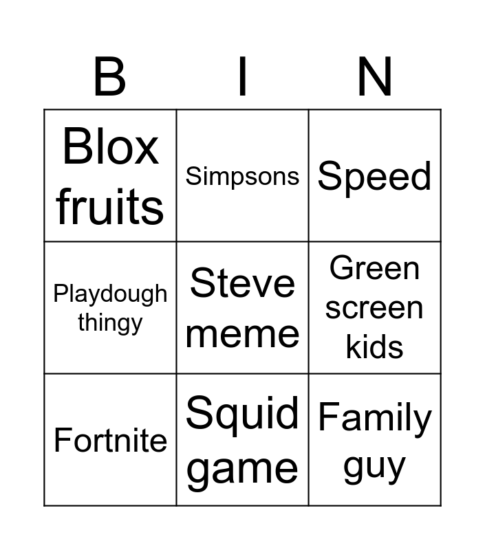 This bingo card has a free space and 8 words: Green screen kids, Speed, Simpsons, Fortnite, Blox fruits, Family guy, Playdough thingy and Squid game.