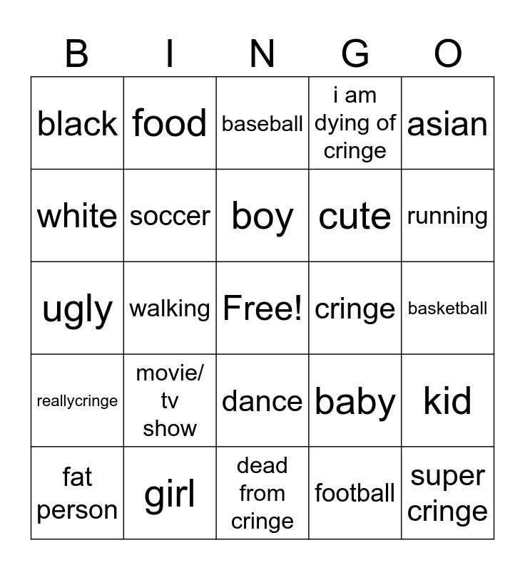 This bingo card has a free space and 24 words: movie/ tv show, girl, boy, fat person, asian, black, white, food, cringe, dance, cute, ugly, baby, kid, soccer, football, basketball, baseball, running, walking, super cringe, reallycringe, i am dying of cringe and dead from cringe.