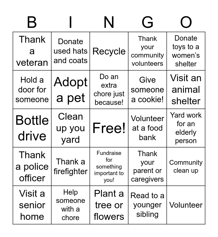 This bingo card has a free space and 24 words: Thank a firefighter, Help someone with a chore, Do an extra chore just because!, Visit a senior home, Donate toys to a women’s shelter, Thank a veteran, Hold a door for someone, Donate used hats and coats, Volunteer at a food bank, Fundraise for something important to you!, Give someone a cookie!, Bottle drive, Thank your parent or caregivers, Community clean up, Adopt a pet, Read to a younger sibling, Yard work for an elderly person, Recycle, Visit an animal shelter, Clean up you yard, Volunteer, Thank a police officer, Thank your community volunteers and Plant a tree or flowers.