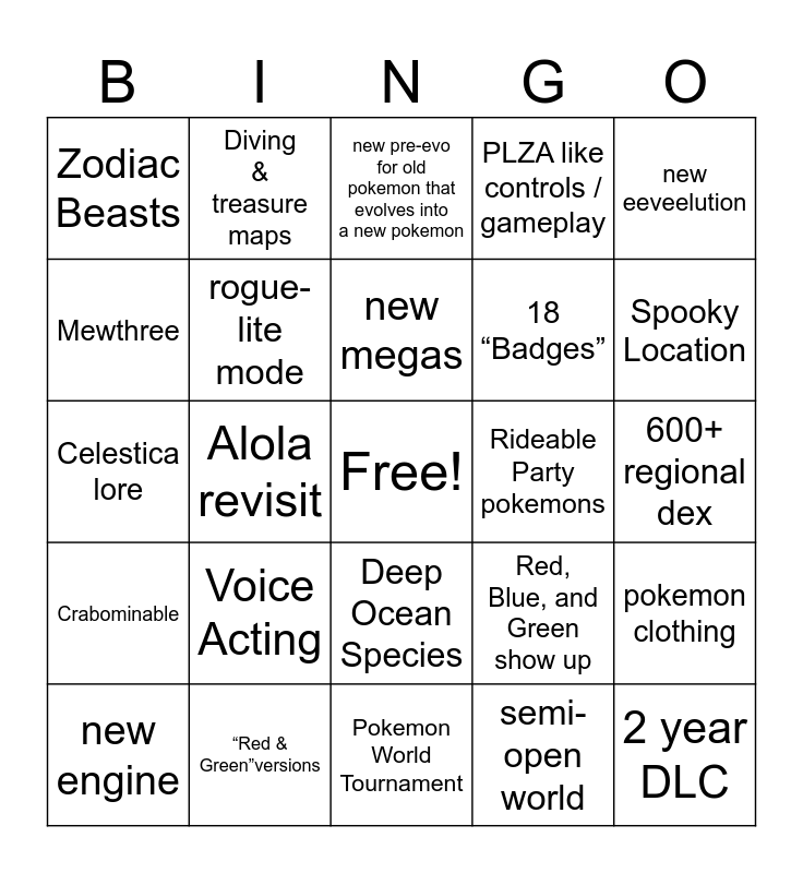 This bingo card has a free space and 24 words: Voice Acting, “Red & Green”versions, new megas, new engine, new eeveelution, Zodiac Beasts, Mewthree, Diving & treasure maps, Rideable Party pokemons, Deep Ocean Species, 18 “Badges”, Celestica lore, Red, Blue, and Green show up, pokemon clothing, rogue-lite mode, semi-open world, 600+ regional dex, new pre-evo for old pokemon that evolves into a new pokemon, Spooky Location, Alola revisit, 2 year DLC, Crabominable, PLZA like controls / gameplay and Pokemon World Tournament.