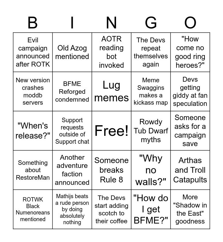This bingo card has a free space and 24 words: Another adventure faction announced, Mathijs beats a rude person by doing absolutely nothing, Lug memes, ROTWK Black Numenoreans mentioned, "How come no good ring heroes?", Evil campaign announced after ROTK, New version crashes moddb servers, Old Azog mentioned, Rowdy Tub Dwarf myths, Someone breaks Rule 8, Meme Swaggins makes a kickass map, "When's release?", "Why no walls?", Arthas and Troll Catapults, BFME Reforged condemned, "How do I get BFME?", Someone asks for a campaign save, AOTR reading bot invoked, Devs getting giddy at fan speculation, Support requests outside of Support chat, More "Shadow in the East" goodness, Something about RestoreMan, The Devs repeat themselves again and The Devs start adding scotch to their coffee.