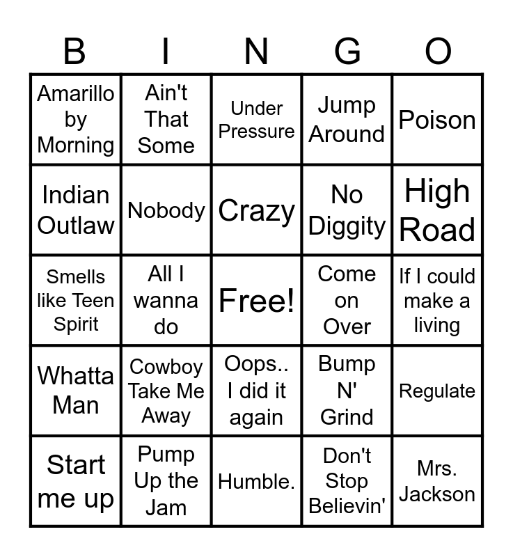 This bingo card has a free space and 43 words: Hey ya!, Mrs. Jackson, Bette Davis Eyes, Start me up, Super Freak, Don't Stop Believin', Under Pressure, Vogue, Poison, Pump Up the Jam, Jump Around, Come on Over, Oops.. I did it again, Cowboy Take Me Away, Toxic, Humble., Meet in the Middle, Smells like Teen Spirit, Cowgirls, High Road, Ain't That Some, Pink Pony Club, Friends in Low Places, Amarillo by Morning, Straight Tequila Night, If I could make a living, I Walk the Line, The sign, Bump N' Grind, Whatta Man, Fantastic Voyage, Regulate, Back & Forth, All I wanna do, Can we talk, Linger, Go DJ, Crazy, Indian Outlaw, No Diggity, Candy Rain, Nobody and Get Ur Freak on.