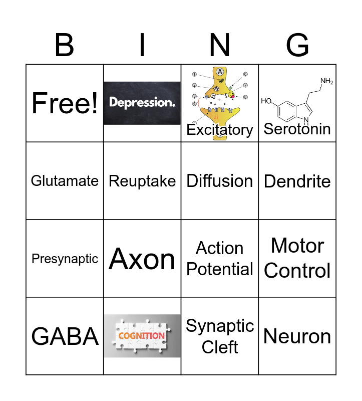 This bingo card has 4 images and 14 words: Motor Control, Excitatory, Free!, Presynaptic, Action Potential, Synaptic Cleft, Glutamate, Reuptake, GABA, Serotonin, Axon, Dendrite, Diffusion and Neuron.