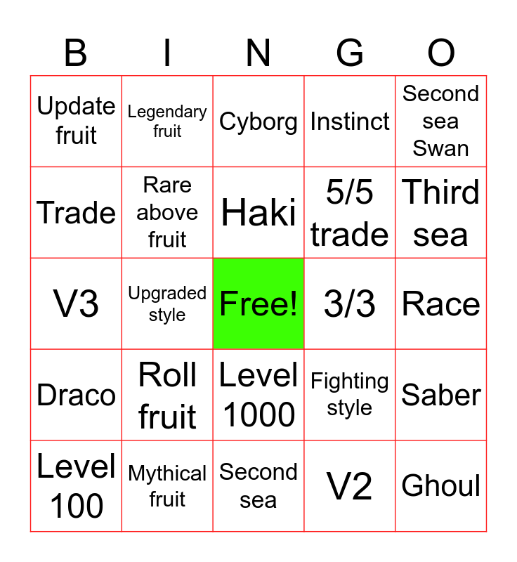 This bingo card has a free space and 24 words: Level 100, Roll fruit, Haki, V2, Second sea Swan, Update fruit, Legendary fruit, Cyborg, 3/3, Race, V3, Rare above fruit, Fighting style, Saber, Trade, Mythical fruit, Second sea, Instinct, Third sea, Draco, Upgraded style, Level 1000, 5/5 trade and Ghoul.