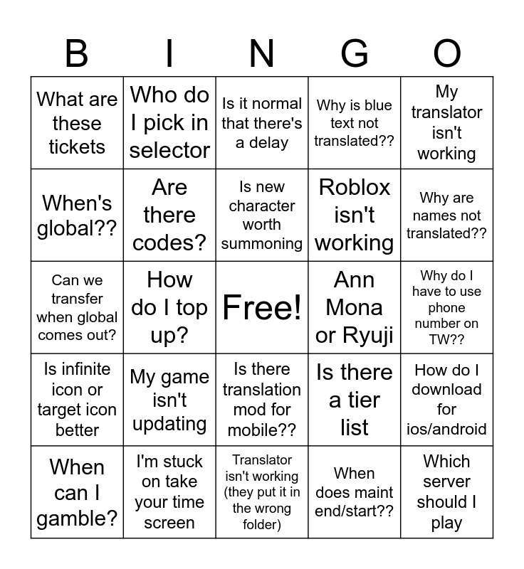 This bingo card has a free space and 24 words: My game isn't updating, I'm stuck on take your time screen, Is new character worth summoning, When can I gamble?, My translator isn't working, What are these tickets, When's global??, Who do I pick in selector, Ann Mona or Ryuji, Is there translation mod for mobile??, Roblox isn't working, Can we transfer when global comes out?, Is there a tier list, How do I download for ios/android, Are there codes?, When does maint end/start??, Why do I have to use phone number on TW??, Is it normal that there's a delay, Why are names not translated??, How do I top up?, Which server should I play, Is infinite icon or target icon better, Why is blue text not translated?? and Translator isn't working (they put it in the wrong folder).