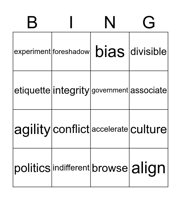 This bingo card has a free space and 15 words: politics, align, bias, experiment, associate, etiquette, conflict, browse, integrity, agility, culture, divisible, government, foreshadow and indifferent.