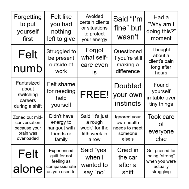 This bingo card has a free space and 25 words: Didn’t have energy to hangout with friends or family, Said “yes” when I wanted to say “no”, Forgot what self-care even is, Felt alone, Had a “Why am I doing this?” moment, Forgetting to put yourself first, Felt numb, Felt like you had nothing left to give, Doubted your own instincts, Said “It’s just a rough week” for the fifth week in a row, Questioned if you’re still making a difference, Fantasized about switching careers during a shift, Ignored your own health needs to meet someone else’s, Took care of everyone else, Struggled to be present outside of work, Felt emotionally shut down, Found yourself irritable over tiny things, Avoided certain clients or situations to protect your energy, Thought about a client’s pain long after hours, Felt shame for needing help yourself, Got praised for being “strong” when you were actually struggling, Experienced guilt for not feeling as compassionate as you used to, Zoned out mid-conversation because your brain was overloaded, Said “I’m fine” but wasn’t and Cried in the car after a shift.