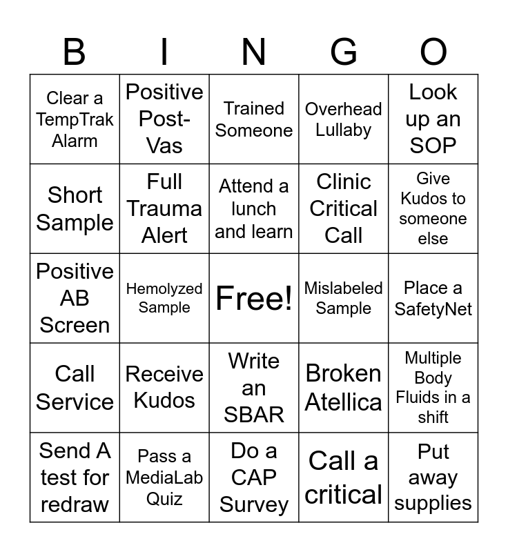 This bingo card has a free space and 24 words: Receive Kudos, Pass a MediaLab Quiz, Attend a lunch and learn, Send A test for redraw, Look up an SOP, Clear a TempTrak Alarm, Short Sample, Positive Post-Vas, Mislabeled Sample, Write an SBAR, Clinic Critical Call, Positive AB Screen, Broken Atellica, Multiple Body Fluids in a shift, Full Trauma Alert, Call a critical, Place a SafetyNet, Trained Someone, Give Kudos to someone else, Hemolyzed Sample, Put away supplies, Call Service, Overhead Lullaby and Do a CAP Survey.