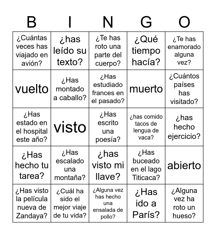 This bingo card has a free space and 34 words: ¿Has estado en Cancún?, ¿Has ido a París?, ¿Has ganado la lotería algún día?, ¿Has estudiado para el examen?, ¿Has hecho tu tarea?, ¿Has montado a caballo?, ¿Te has enamorado alguna vez?, ¿Has visto la película nueva de Zandaya?, ¿has leído su texto?, ¿Has visto a mi amigo?, ¿Has estudiado frances en el pasado?, ¿Te has roto una parte del cuerpo?, ¿Has hecho los quehaceres?, ¿Has hecho una reservación?, ¿has comido tacos de lengua de vaca?, ¿Cuántos países has visitado?, ¿Cuál ha sido el mejor viaje de tu vida?, ¿Has estado en el hospital este año?, ¿Has escalado una montaña?, ¿Has buceado en el lago Titicaca?, ¿has visto mi llave?, ¿has tocado el piano?, ¿Cuántas veces has viajado en avión?, ¿has hecho ejercicio?, ¿Alguna vez has hecho una ensalada de pollo?, ¿Alguna vez ha roto un hueso?, ¿Qué tiempo hacía?, ¿Adónde fueron ellos?, muerto, vuelto, hecho, visto, abierto and satisfecho.