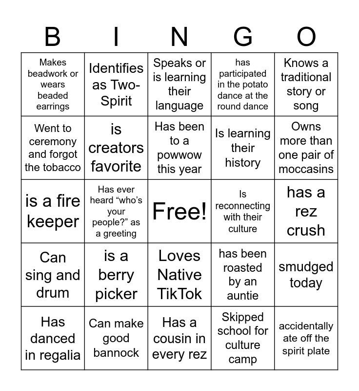 This bingo card has a free space and 24 words: is a berry picker, Can make good bannock, Has been to a powwow this year, Has danced in regalia, Knows a traditional story or song, Makes beadwork or wears beaded earrings, Went to ceremony and forgot the tobacco, Identifies as Two-Spirit, Is reconnecting with their culture, Loves Native TikTok, Is learning their history, is a fire keeper, has been roasted by an auntie, smudged today, is creators favorite, Skipped school for culture camp, has a rez crush, Speaks or is learning their language, Owns more than one pair of moccasins, Has ever heard “who’s your people?” as a greeting, accidentally ate off the spirit plate, Can sing and drum, has participated in the potato dance at the round dance and Has a cousin in every rez.