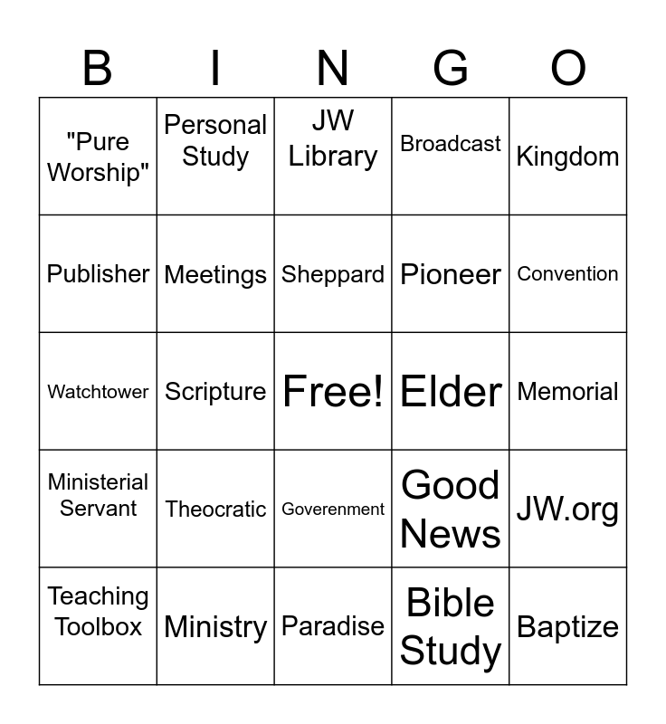 This bingo card has a free space and 24 words: Theocratic, Ministry, Sheppard, Teaching Toolbox, Kingdom, "Pure Worship", Publisher, Personal Study, Elder, Goverenment, Pioneer, Watchtower, Good News, JW.org, Meetings, Bible Study, Memorial, JW Library, Convention, Scripture, Baptize, Ministerial Servant, Broadcast and Paradise.