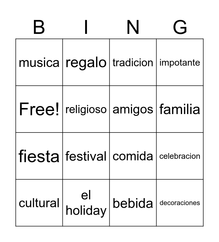 This bingo card has 16 words: el holiday, celebracion, tradicion, musica, fiesta, regalo, comida, bebida, Free!, religioso, cultural, impotante, festival, familia, amigos and decoraciones.