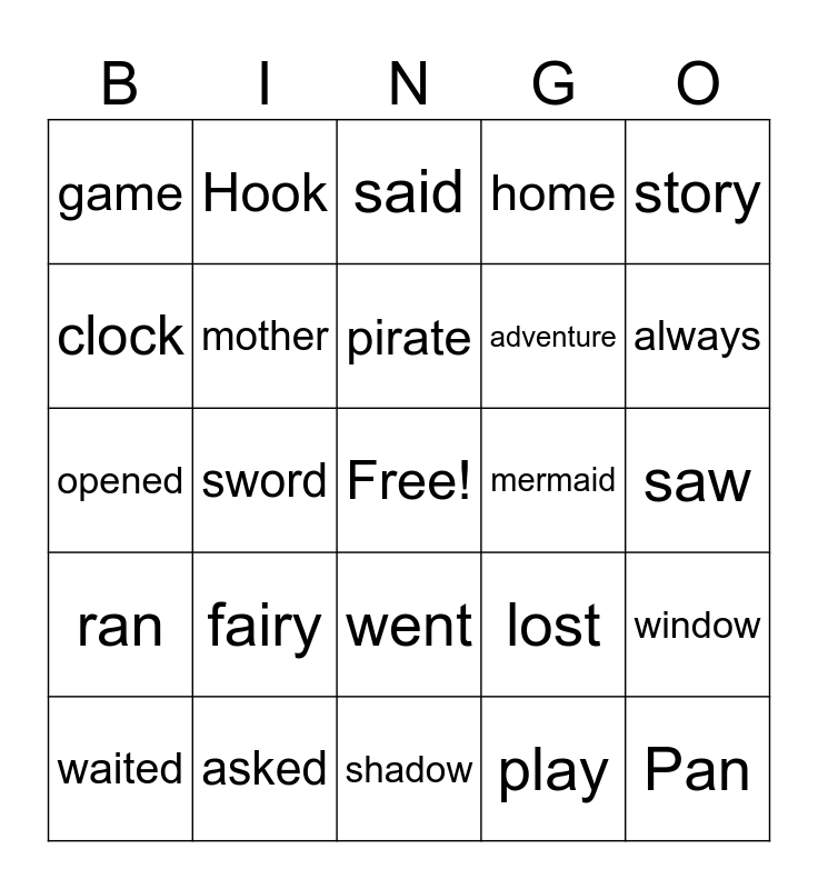 This bingo card has a free space and 52 words: Peter, Pan, Wendy, shadow, fairy, Tinker Bell, Hook, crocodile, clock, tick-tock, mother, fly, window, lost, boys, Neverland, pirate, mermaid, Indian, story, sword, play, game, adventure, dream, grow, up, never, always, forget, remember, home, away, back, looked, said, asked, cried, shouted, laughed, thought, saw, ran, came, went, told, flew, opened, closed, slept, waited and watched.