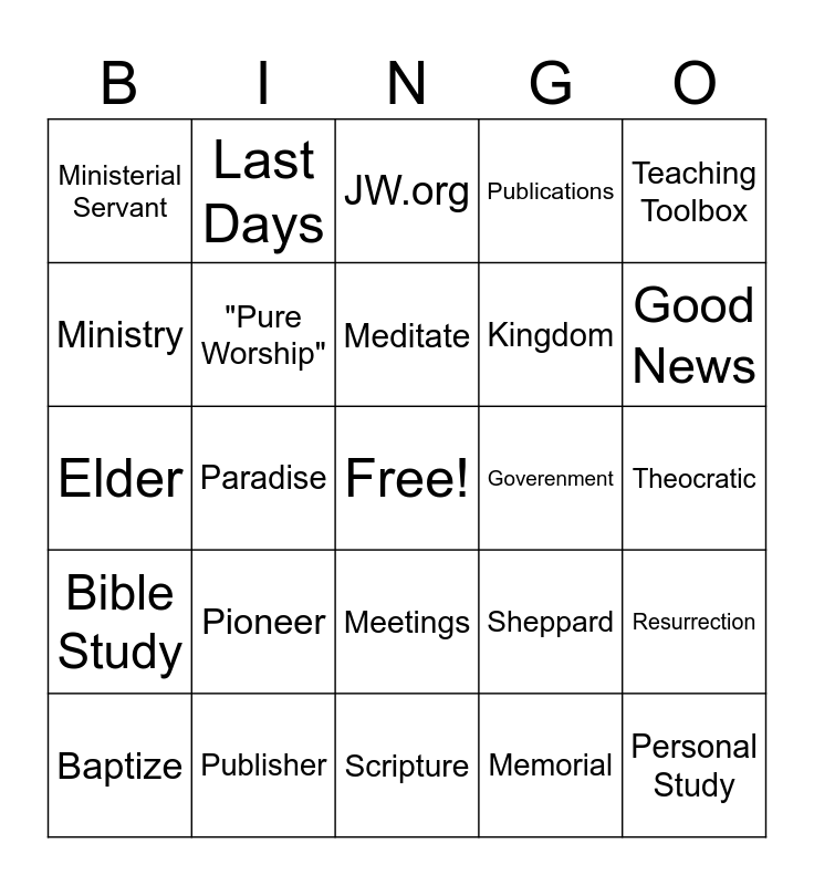 This bingo card has a free space and 29 words: Baptize, Watchtower, Paradise, JW Library, Ministerial Servant, JW.org, "Pure Worship", Pioneer, Goverenment, Publisher, Theocratic, Personal Study, Scripture, Memorial, Good News, Broadcast, Meetings, Bible Study, Teaching Toolbox, Elder, Sheppard, Convention, Kingdom, Ministry, Publications, Last Days, Resurrection, Meditate and Blessings.